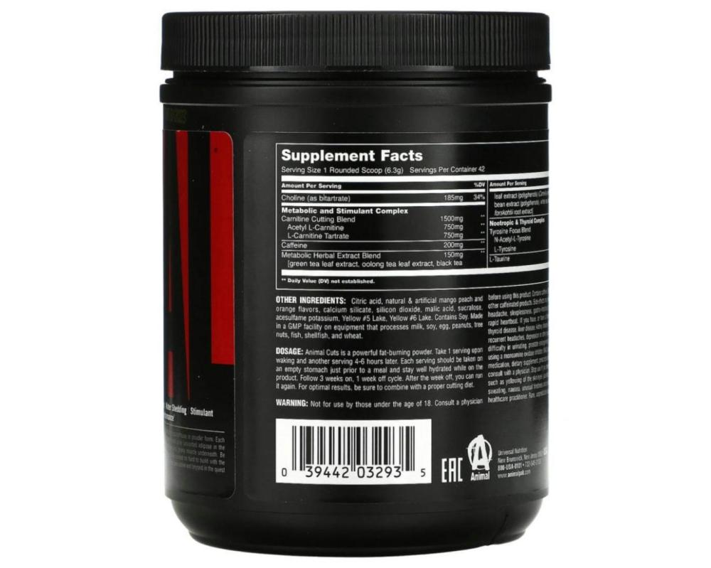 ANIMAL CUTS® Animal Cuts - это мощный метаболический продукт в виде порошка. Каждая точно подобранная доза поможет избавиться от нежелательного жира в межсезонье, чтобы обнажить твердые, зернистые мышцы. Будьте чудаком и станьте чудаком, над которым вы так усердно работали.
