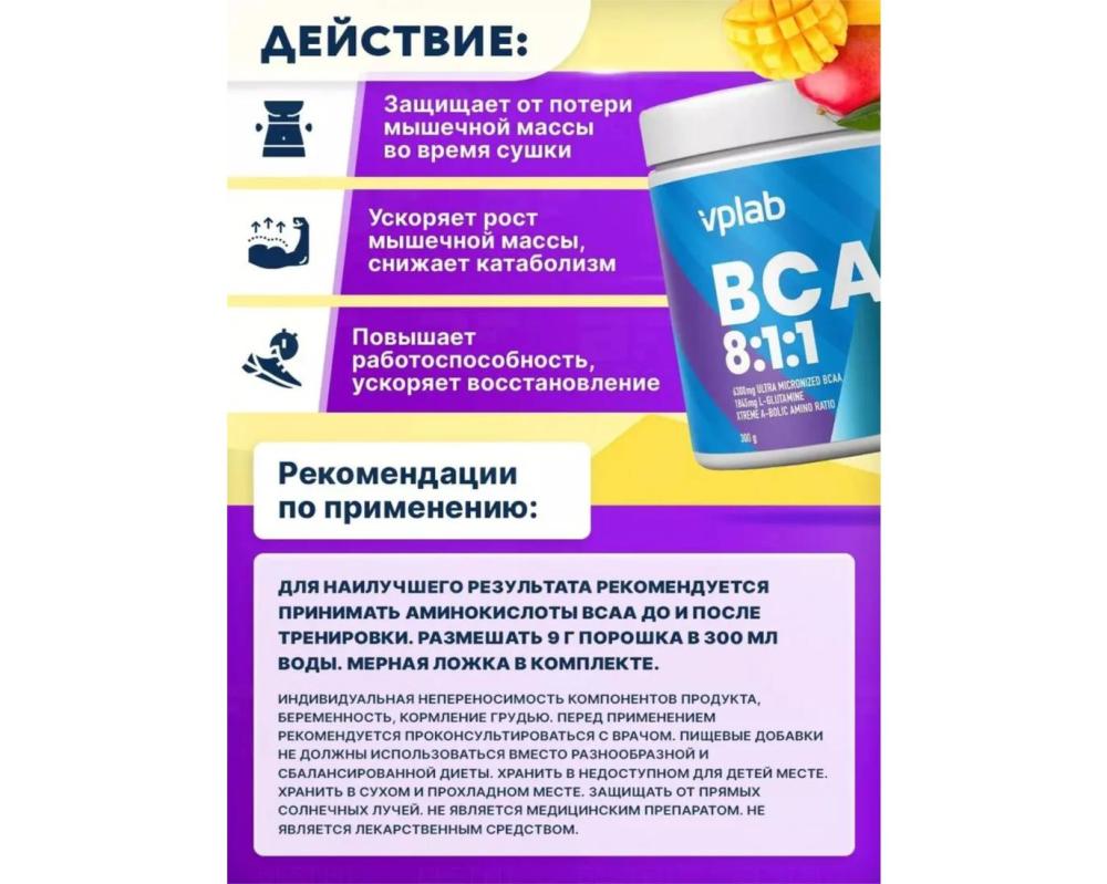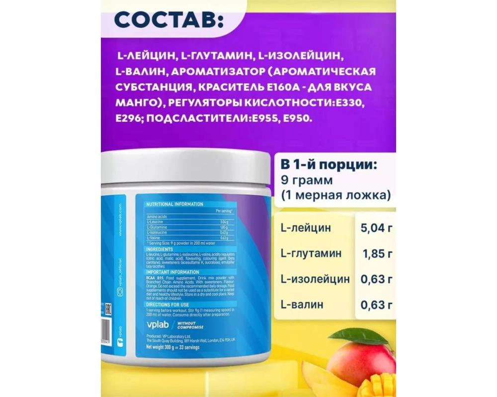 Незаменимые аминокислоты BCAA 8:1:1 VPLAB 300 грамм со вкусом манго
