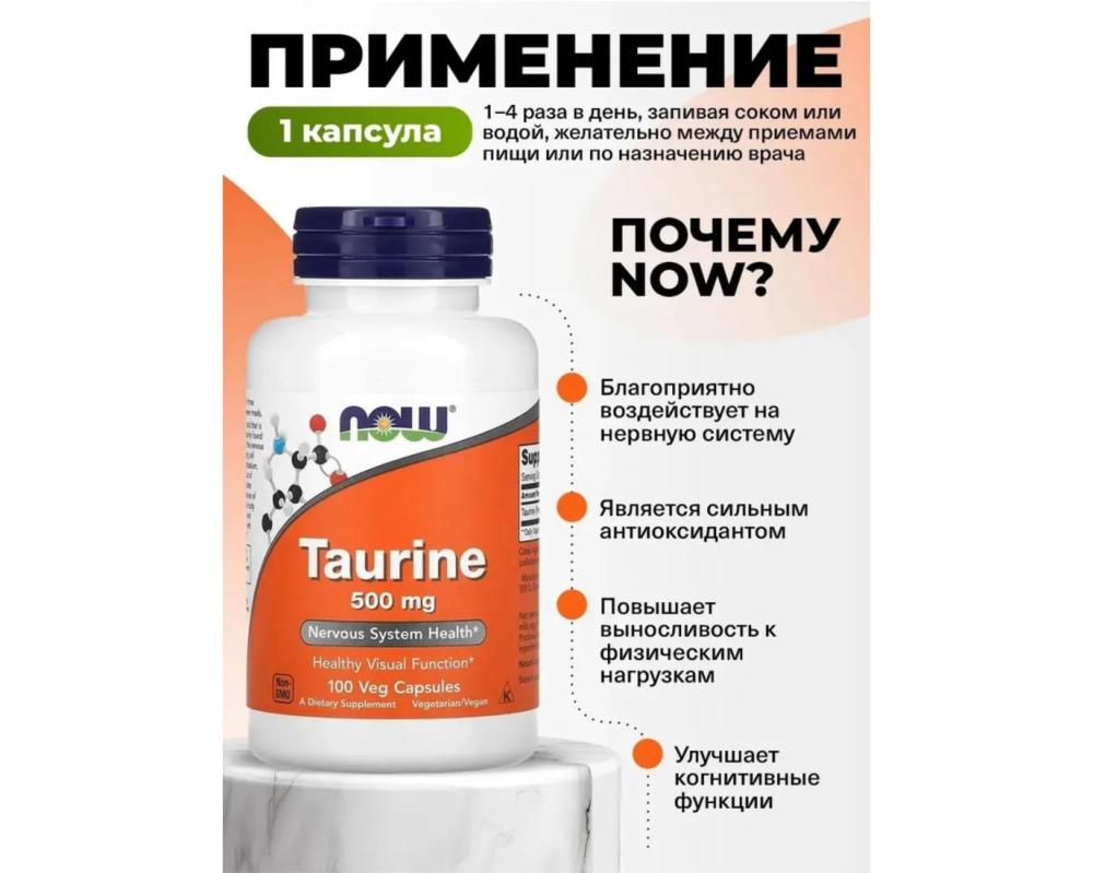 Аминокислота Taurine 500 mg NOW 100 веганских капсул