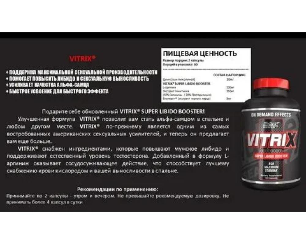 Курс на 30 дней. Средство для улучшения мужских качеств. Для большей выносливости и активности. VITRIX работает! Это натуральное средство, которое постоянно совершенствуется нашими специалистами. По мере развития науки в результате наших поисков наиболее эффективной комбинации ингредиентов был получен продукт, повышающий мужскую силу, который по-прежнему остается превосходным. В этом продукте используются только растительные капсулы, которые не содержат продуктов животного происхождения.