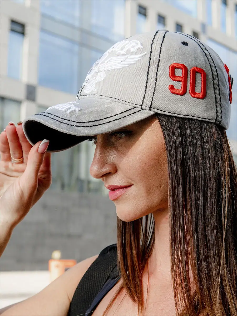 Бейсболка с изогнутым козырьком, объемными вышивками и регулируемой застежкой на задней части.