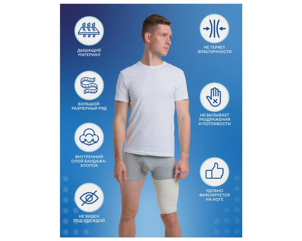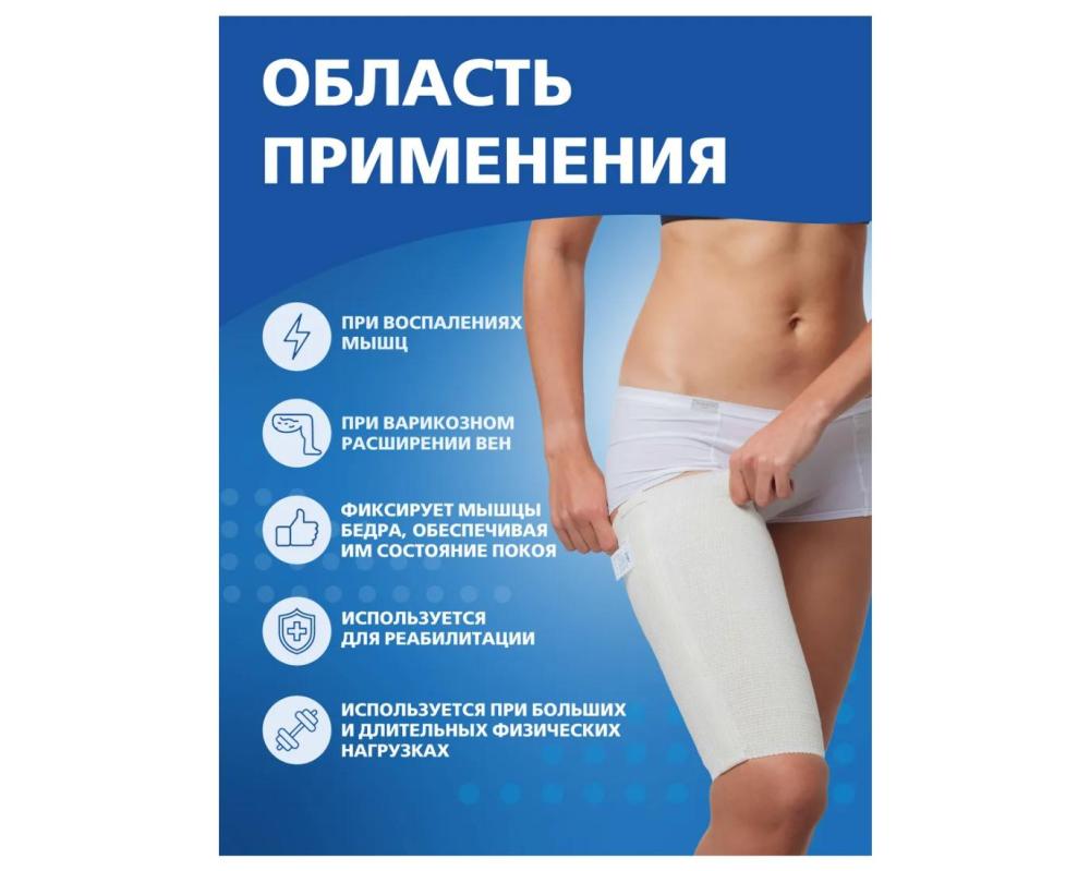 Эластичная повязка на бедро применяется при растяжении и при воспалениях мышц, для профилактики и лечения варикоза при расширении вен с локализацией на бедре. Суппорт на бедро фиксирует мышцы, обеспечивая им состояние покоя. Фиксатор бедра используется для реабилитации в посттравматическом периоде, повязка на бедро от натирания также применяется для профилактики при больших и длительных физических нагрузках. Бандаж на бедро компрессионный удобен и безопасен, поскольку фиксатор мышц бедра при растяжениях изготавливается из медицинского трикотажа с большим содержанием натурального хлопка и латекса. Правила ухода за повязкой на область бедра: Стирать ортез на бедро нужно вручную с использованием средств для трикотажа. Отжимать нельзя, но можно подсушить полотенцем, а затем сушить в расправленном виде на ровной поверхности. При необходимости можно гладить на минимальной температуре.